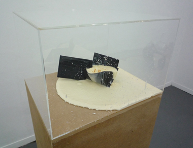So she works with the condition of aggregation of water, for example as mist, foam or ice. With the factual movement correlates the seeming mutability of the used rigid materials, forms of droplets or a doughy mass may be represented.